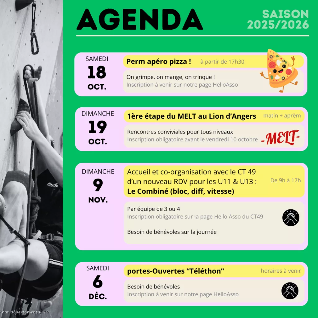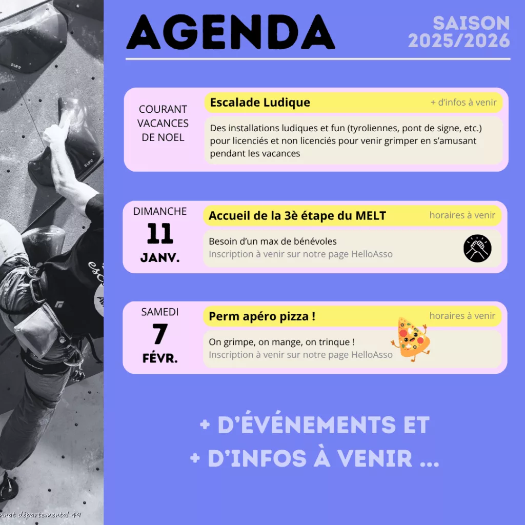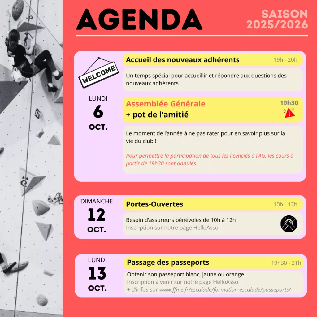 Tous les 2 mois environ, le club organise des portes-ouvertes pour faire (re)découvrir l’escalade au grand public. Prochaines PO les dimanches : 14 septembre, 12 octobre et 6 décembre 2025 (de 10h à 12h).