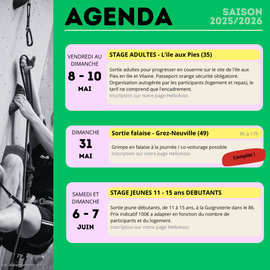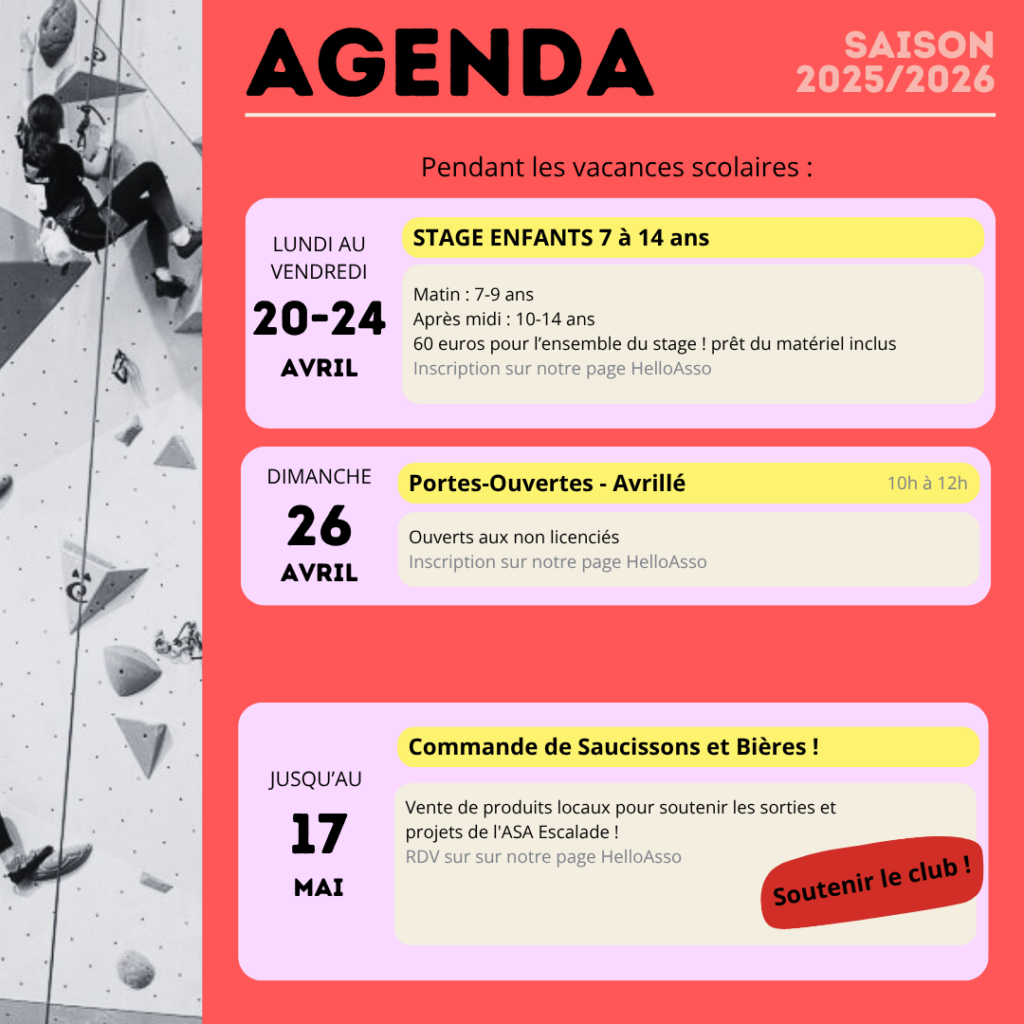 Des stages et sorties sont régulièrement proposés à nos adhérents. RDV sur notre page HelloAsso-asa-escalade pour en savoir plus et réserver votre place.