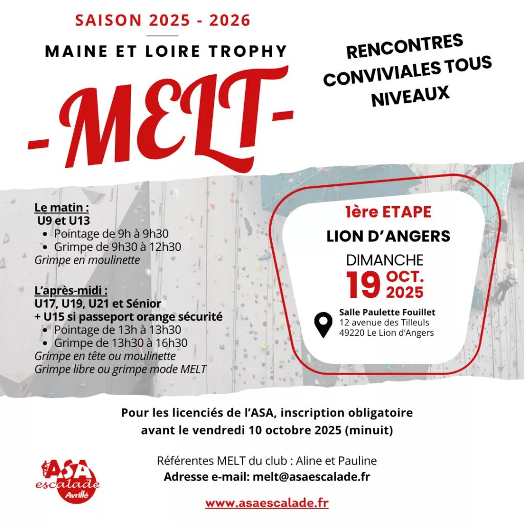 - Mode grimpe MELT : une 15e de voies vous seront proposées (remise d’une liste lors du pointage) et vous devrez en réaliser un maximum en 3h. Un classement sera réalisé pour les personnes ayant fait ce choix.