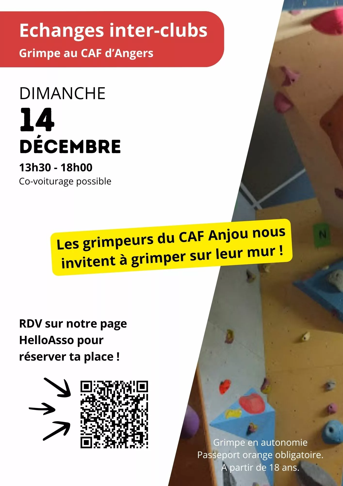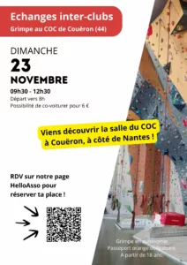 Tous les 2 mois environ, le club organise des portes-ouvertes pour faire (re)découvrir l’escalade au grand public. Prochaines PO les dimanches : 14 septembre, 12 octobre et 6 décembre 2025 (de 10h à 12h).