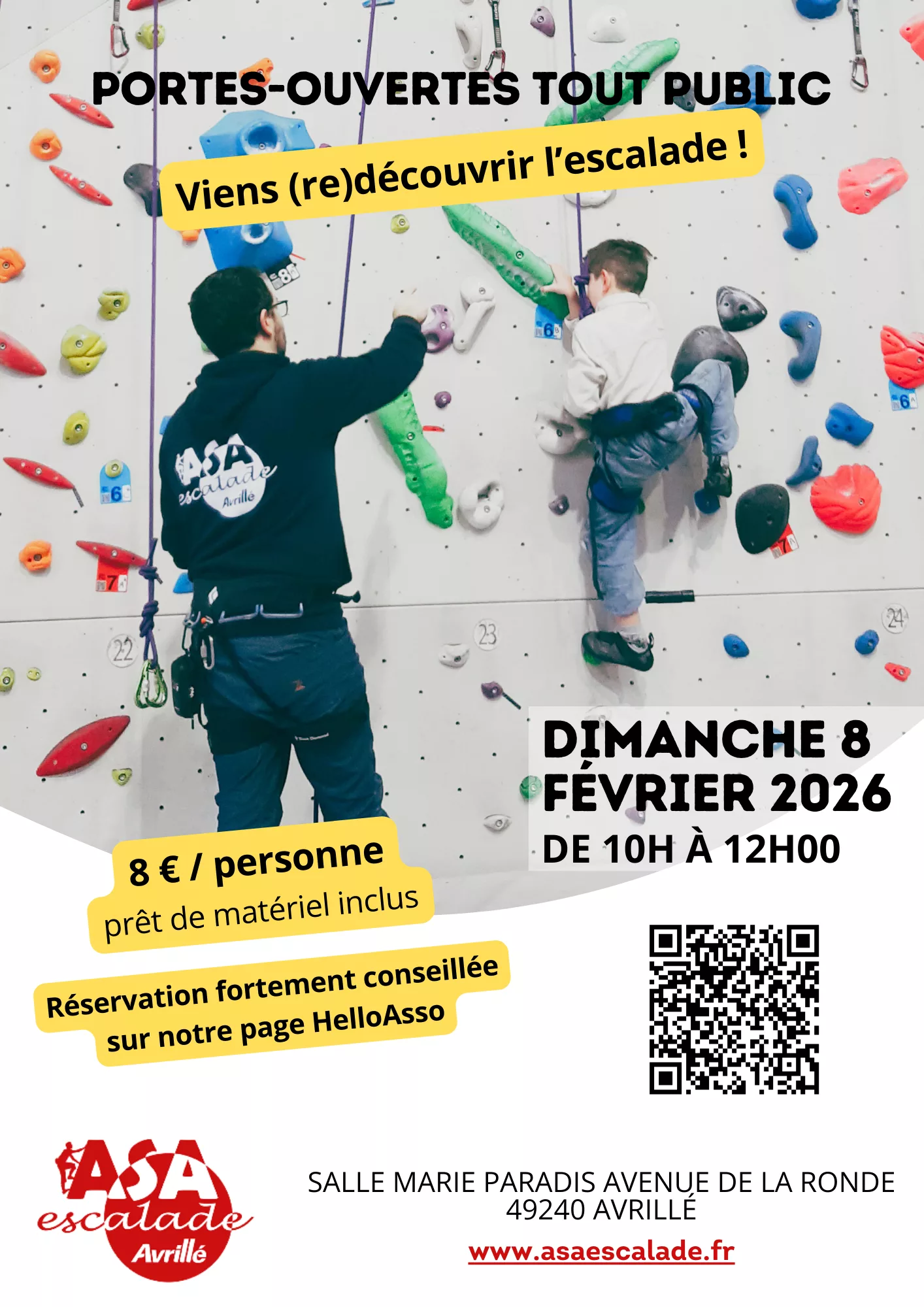 Rendez-vous à la salle Marie Paradis (Avrillé) dimanche 8 février de 10H à 12H. Les bénévoles du club seront là pour vous faire grimper en toute sécurité.
