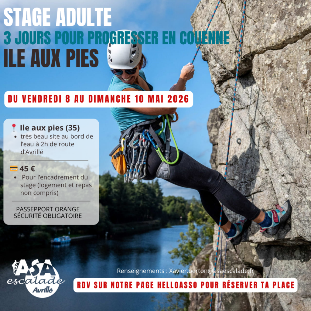 L’ASA Escalade propose, aux adultes licenciés du club, un stage de 3 jours du vendredi 8 mai (férié) au dimanche 10 mai 2026 à l’ile aux pies près de Redon (35).