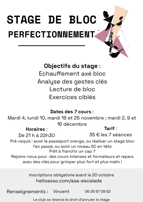 Pour plus de renseignements sur les stages, merci de vous adresser directement à vincent.cosseron@asaescalade.fr
